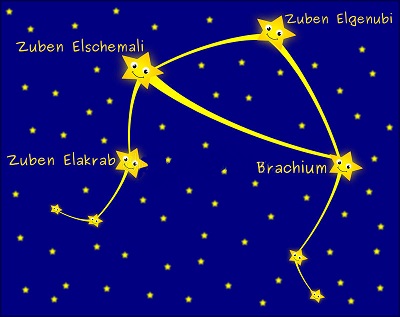 L'étoile, la plus brillante est nommée Zuben Elgenubi. C?est de l?arabe, cela signifie le prix est insuffisant.