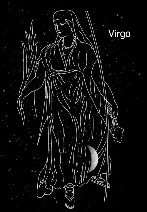 La constellation de la VIERGE est représentée par une femme portant dans une main un épi et dans l?autre main une jeune branche.