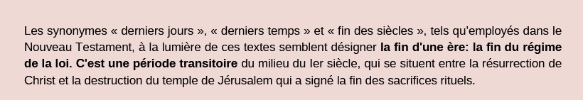 Que signifie les vocables « derniers temps », « derniers jours » et « fin des siècles » employés dans le Nouveau Testament ?